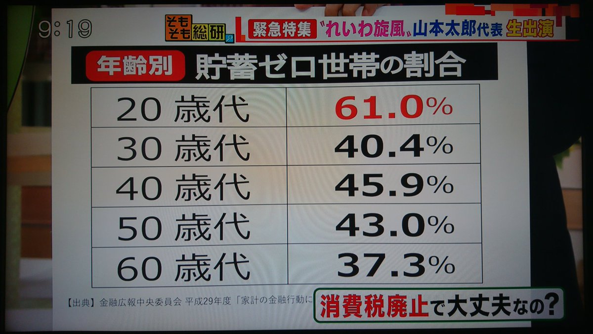 - また貯蓄ゼロ世帯の割合は20代で61%、30代、40代、50代で4割を超えている状態、もうボロボロであることを解説
