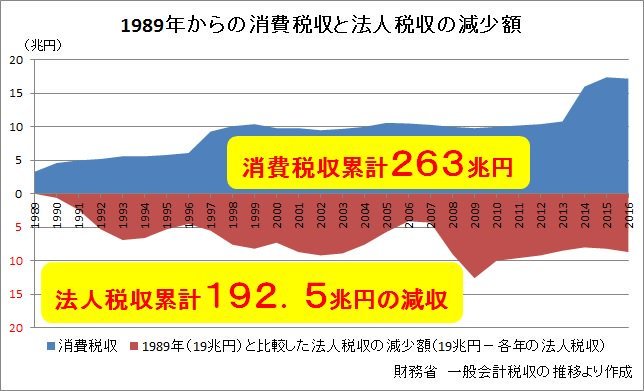 - 今やらなければならないのはデフレの20年からの完全な脱却。その足かせになっているのが消費税。消費税を廃止すると消費が喚起される、投資も生まれる。なぜそれができないかというと消費税が大企業への減税の補填となっているから。法人税減税による減収分の73%は消費税が補填していると説明